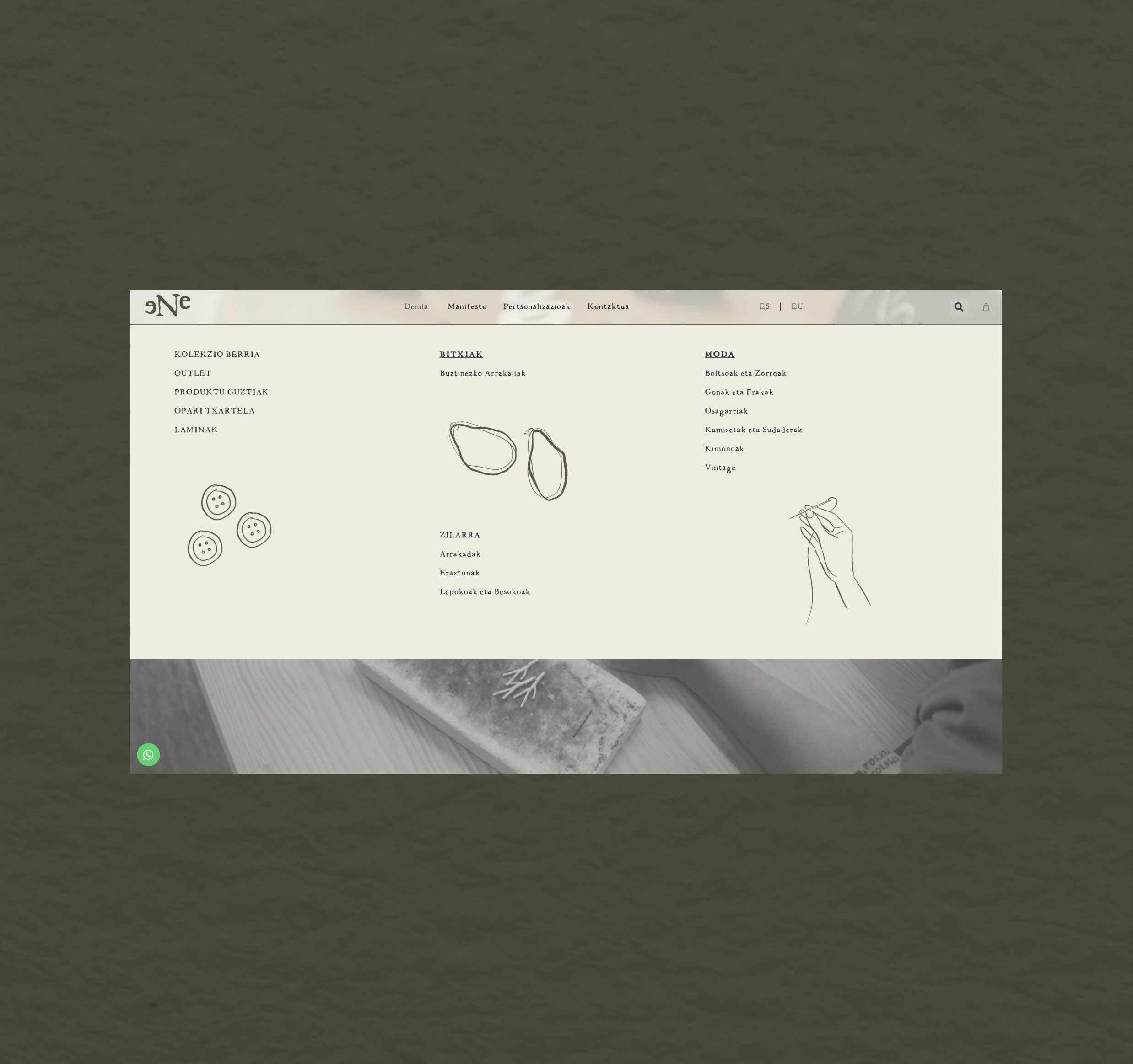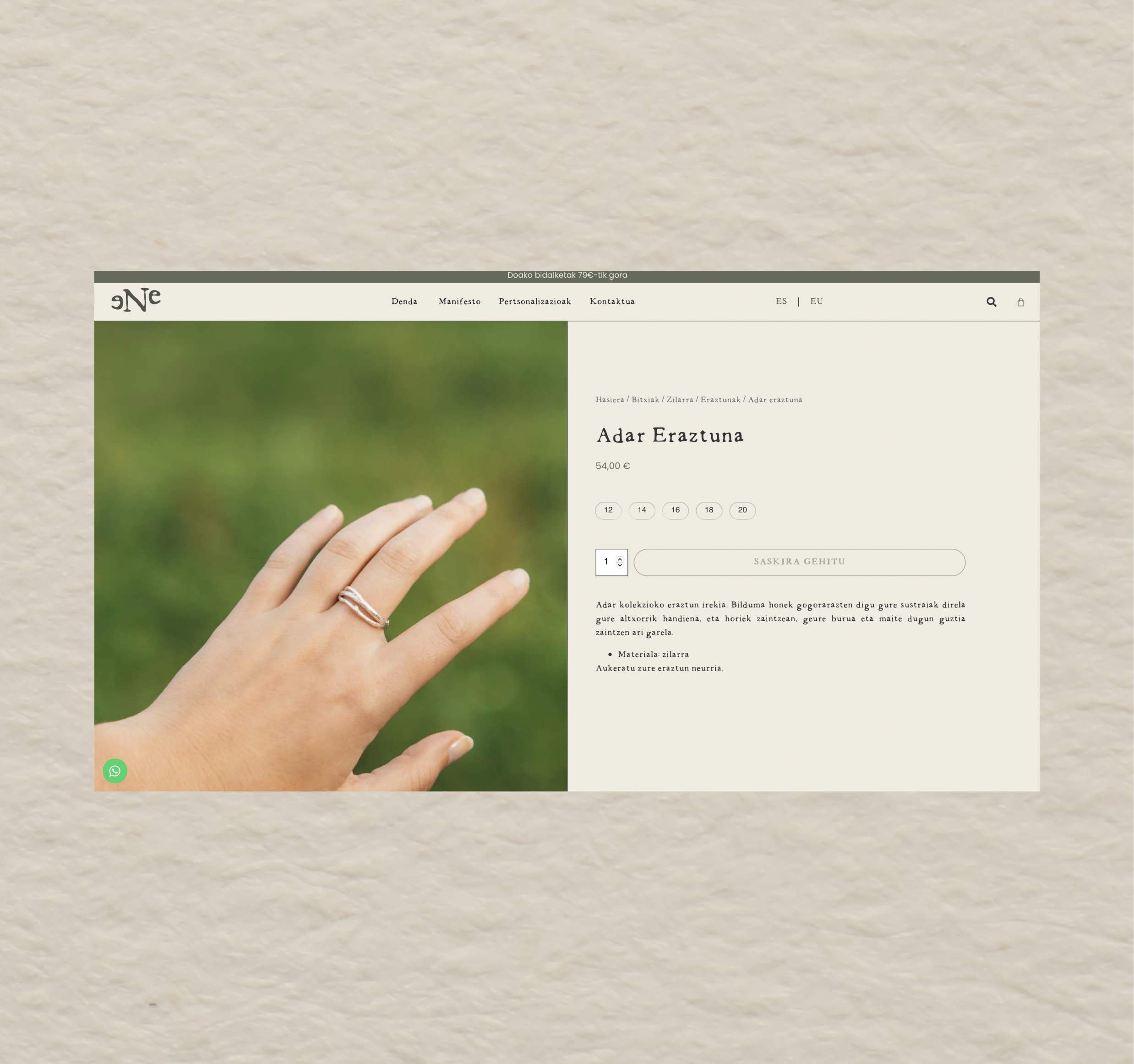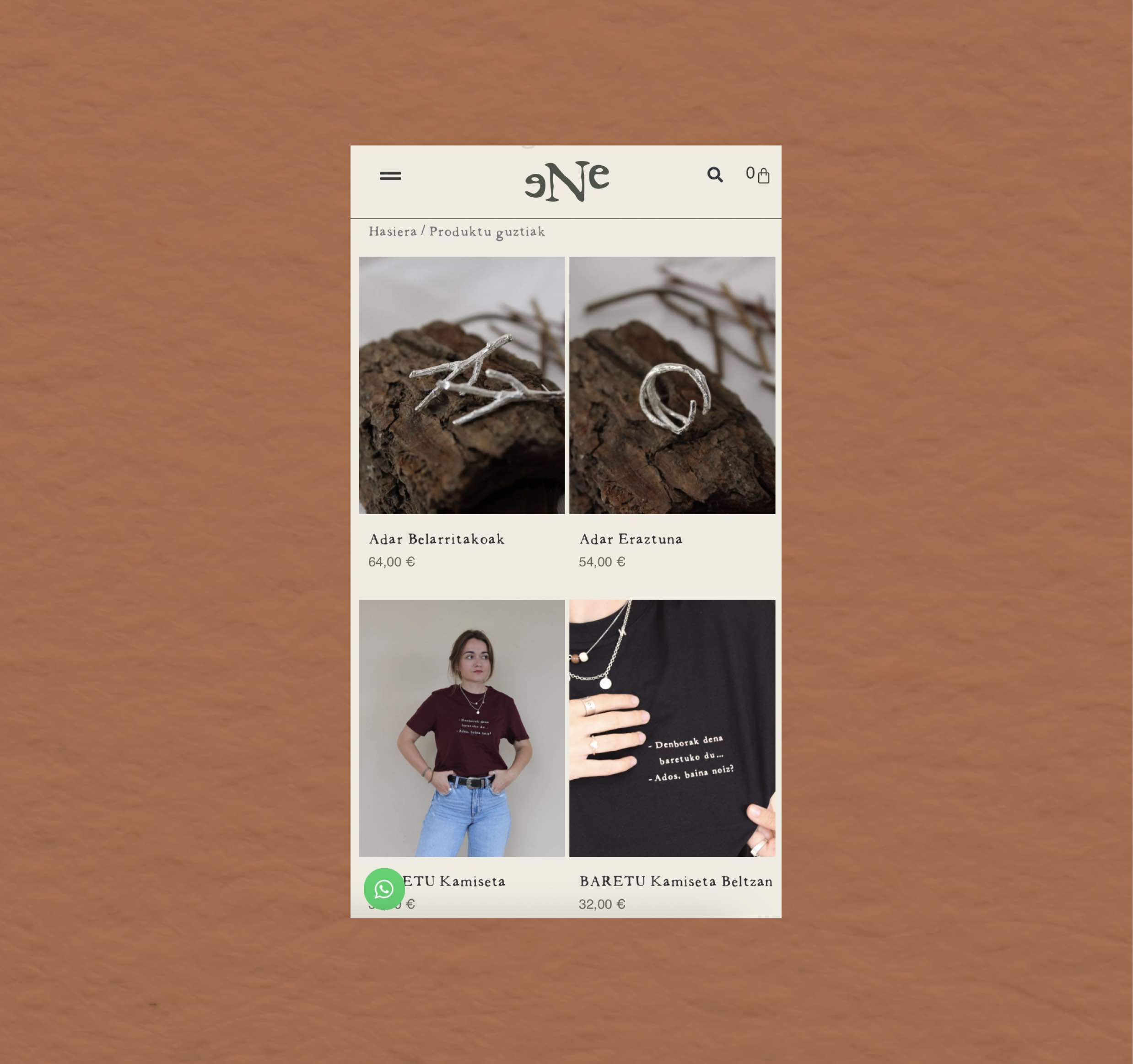 La web de ENE es una extensión fiel del universo de marca que trabajamos. Desde el primer scroll, se siente orgánica, emocional, muy conectada con el trabajo manual y con la historia personal que hay detrás de cada pieza. La navegación está pensada para ser clara, suave, accesible, sin complicaciones ni jerarquías confusas: las colecciones se presentan con naturalidad, como si estuviéramos en el taller con Nagore, explorando su mundo.