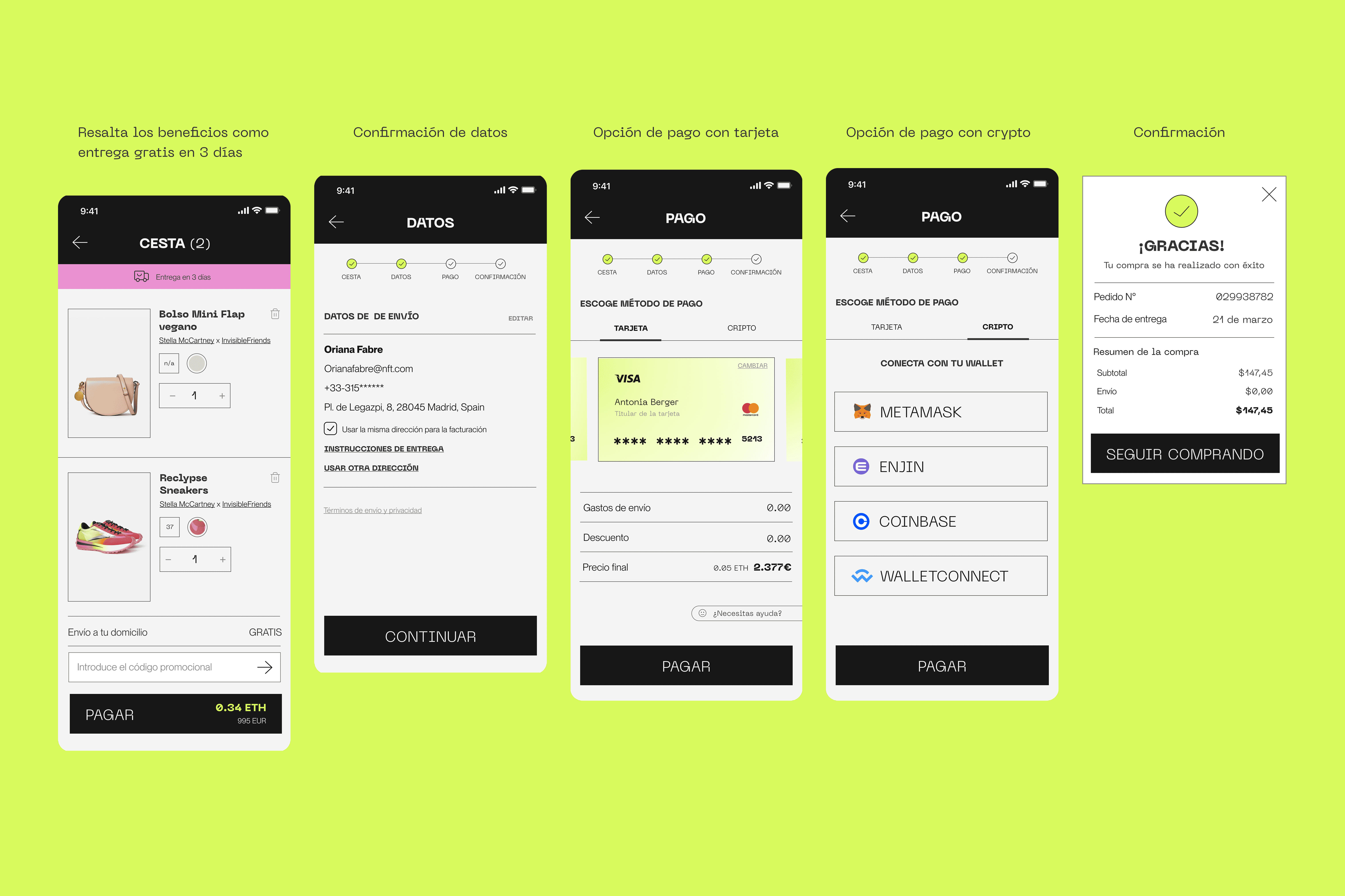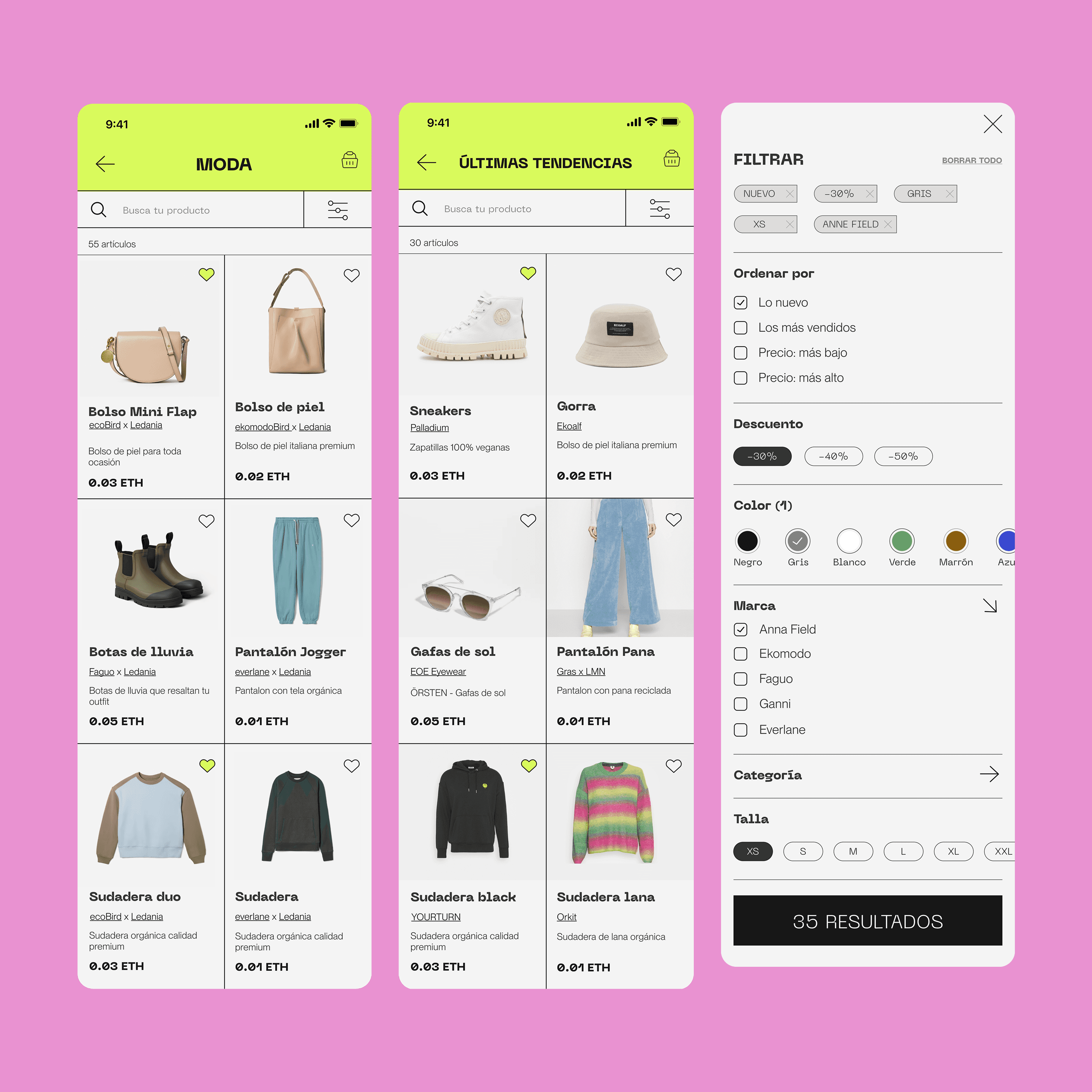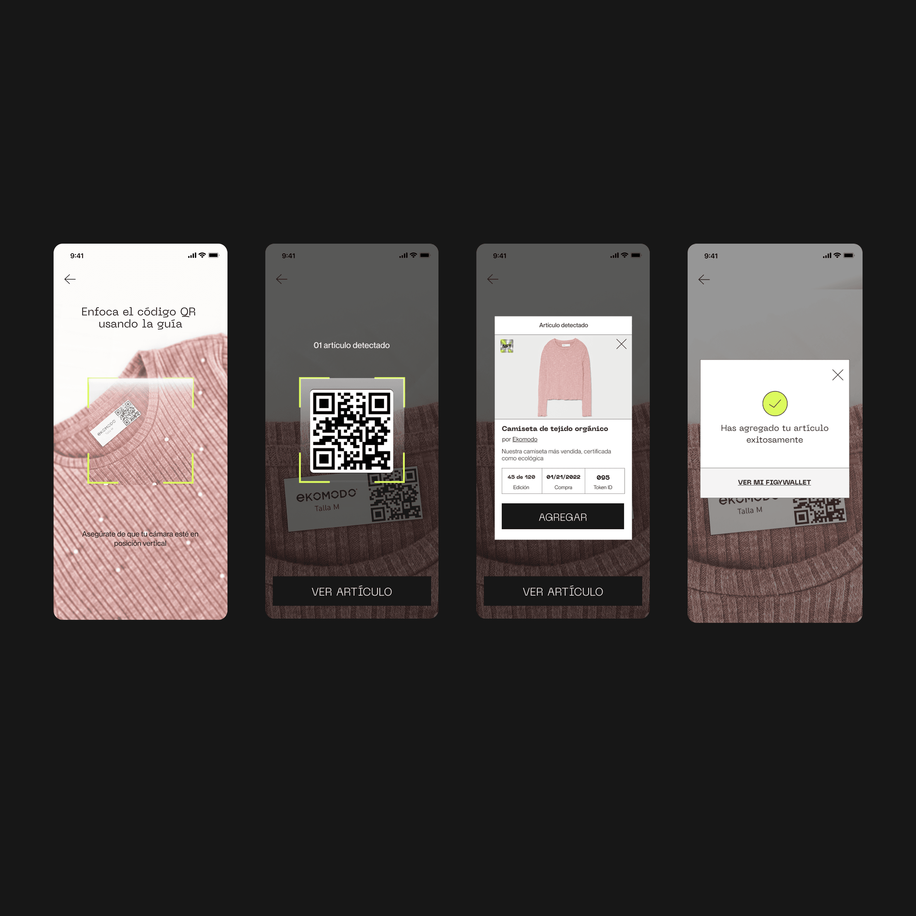 La app ofrece una experiencia fluida desde el inicio: onboarding claro, registro rápido (email o wallet) y navegación intuitiva por un marketplace de productos sostenibles. Cada artículo muestra su trazabilidad completa y su vínculo con un NFT.
